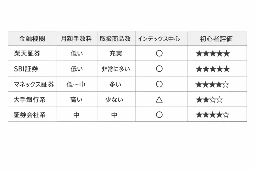 以下は 手数料・商品ラインナップ・初心者向け評価 を総合した比較表です。